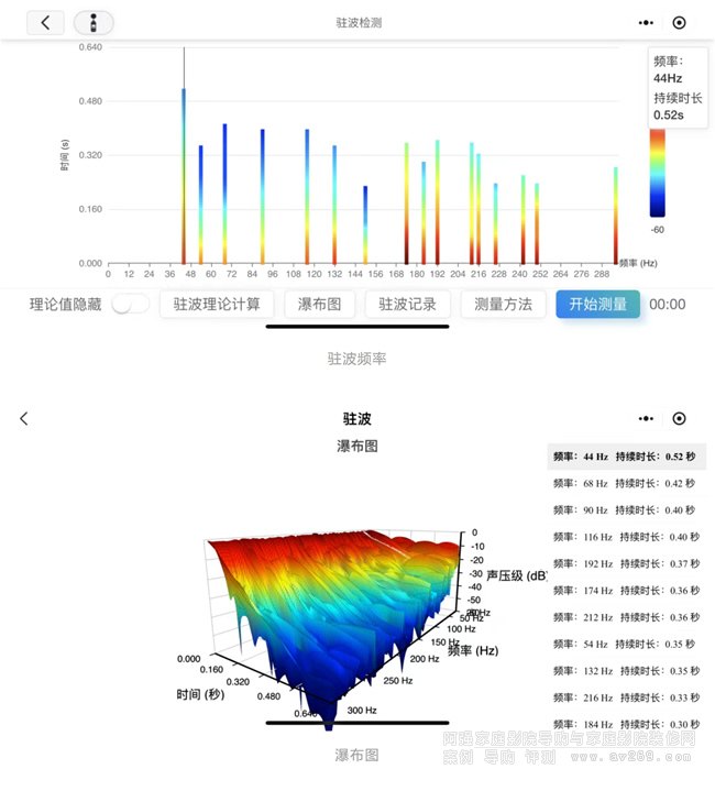 DT Acoustic小程序內置了房間駐波測量,可用3D瀑布圖的方式直觀地看到房間各頻率的聲波衰減情況,并且算法會根據各頻率的聲能衰減情況來自動計算出房間真實駐波頻率,便于現場發現和分析處理駐波,優化室內聲場。