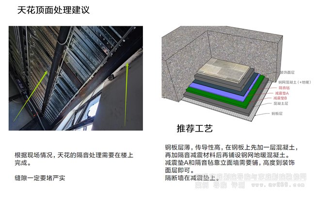 根據現場情況針對墻體,地面,天花頂面及門窗都進行相關工藝的推薦及告知。尤其是原始結構方面的需要在土建期就要進行處理,避免后期隔音方面產生困擾。