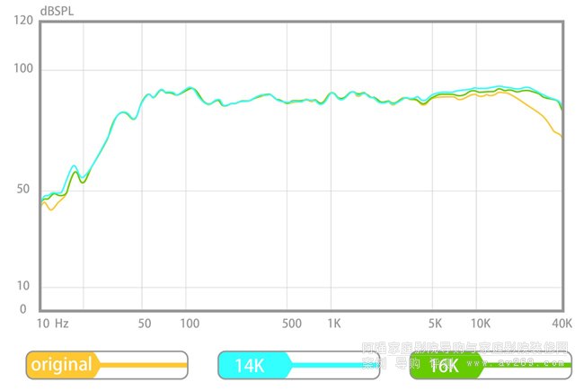 曲線變化示意圖:使用Aperion超高音音箱后,原始音箱曲線/14Khz曲線/16Khz曲線對比