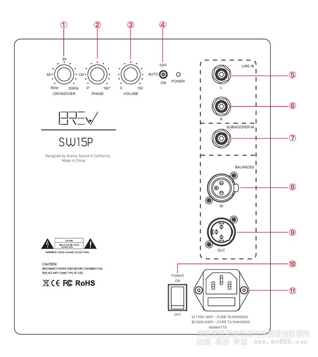 ⑪ 110-120V、220-240V 電源線接口:請一定確認您購買的是適合當?shù)仉妷旱陌姹荆诓迦腚娫粗白屑殭z查輸入電源電壓并確認無誤,如使用錯誤電壓版本,低音炮可能會被燒毀。