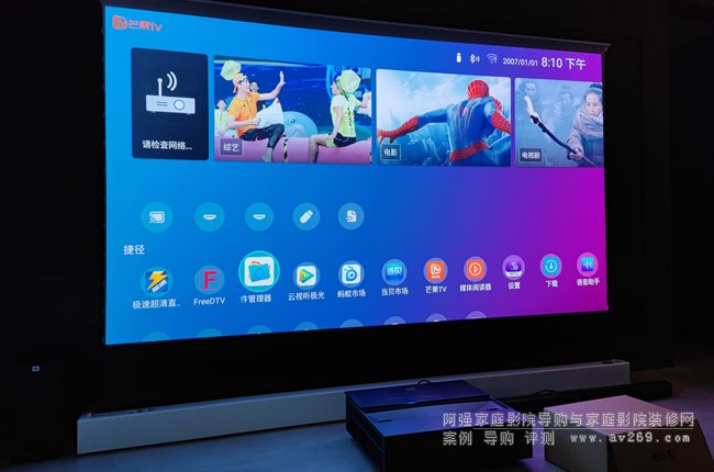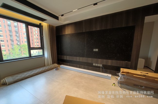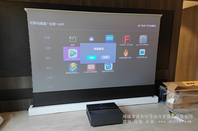 來自天津北辰某小區的案例,在客廳空間采用明基激光電視和地拉幕組合的一套家庭影院系統,客人還配置了一套JBL條型音箱,這樣的組合適合臨時使用,如果是長期使用或裝修進行時阿強推薦使用固定抗光幕,加獨立的多聲道音響系統了。簡單來看看本案圖片供您參考!