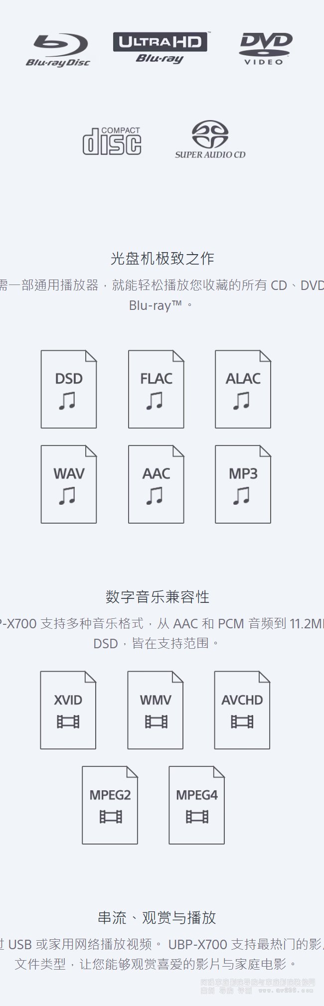 UBP-X700 的播放功能強大,即使 4K Ultra HD Blu-ray™ 光盤器也望塵莫及。 您可以觀賞、聆聽或流任何喜愛的內容,還提供最高畫質的影片與音頻格式,以及眾多熱門串流服務,任君選用。