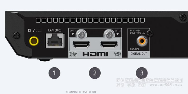 HDMI 輸出: 2 (后置), USB 輸入: 1 (前置), 以太網連接: 1 (后置), 同軸音頻輸出: 1 (后置)