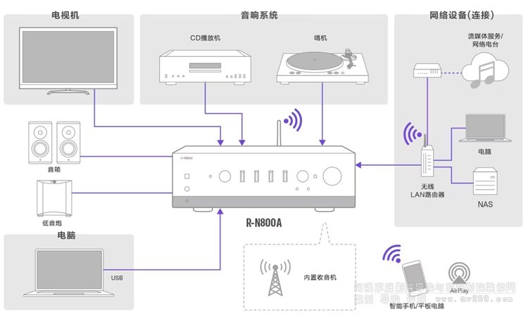 R-N800A 有電視、網絡設備等多種接口,尤其還配備唱機PHONO端口,讓您輕松連接唱機,盡享黑膠音樂的魅力。