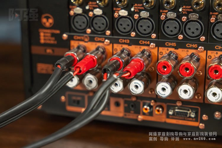 在設備的背面,我們可以看到銅質機箱的壯麗景色,這是馬蘭士眾所周知的。以及我們所有的輸入和輸出。12 個通道,因此 12 個非平衡和平衡輸入。在每對放大器通道的頂部,都有一個開關,用于在不平衡 RCA 或平衡 XLR 音頻輸入之間切換,因此該裝置應該與幾乎所有標準家庭影院處理器或多合一家庭影院接收器兼容。