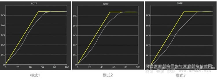 接下來再看看三種不同的動(dòng)態(tài)映射模式在實(shí)際的EOTF電光轉(zhuǎn)換曲線測試部分的差異性,從左到右分別是模式1、模式2和模式3。