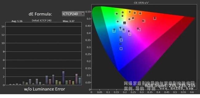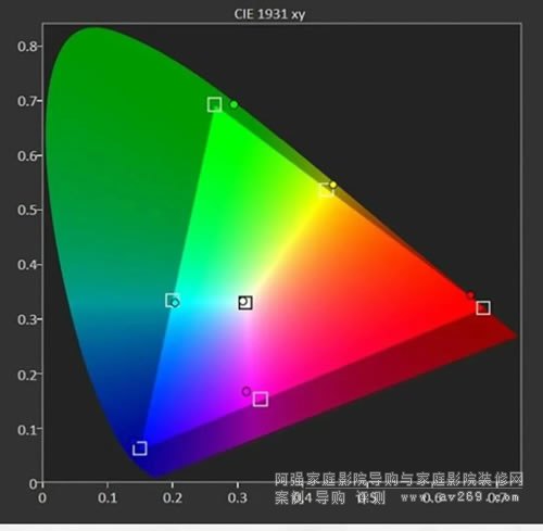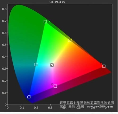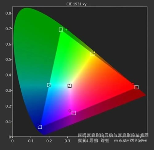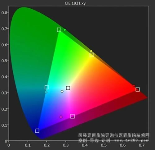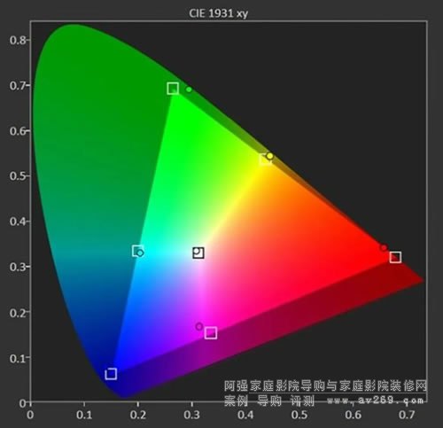 除了色域覆蓋范圍和亮度,色準(zhǔn)也是玩家們非常關(guān)心的話題。考慮到索尼家用投影P7各個(gè)畫面預(yù)設(shè)模式的色域覆蓋范圍相近,下面以明亮電影模式來進(jìn)行色準(zhǔn)方面的測試,色溫設(shè)定為D65,同時(shí)為了盡量減少投影幕和環(huán)境光干擾因素,利用機(jī)內(nèi)的白平衡校正功能,進(jìn)一步優(yōu)化了色溫表現(xiàn)。