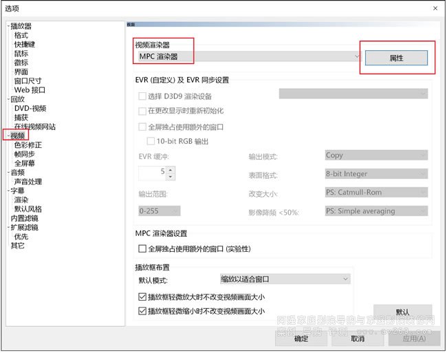 然后把視頻渲染器改成:MPC渲染器,再點擊旁邊的“屬性”: