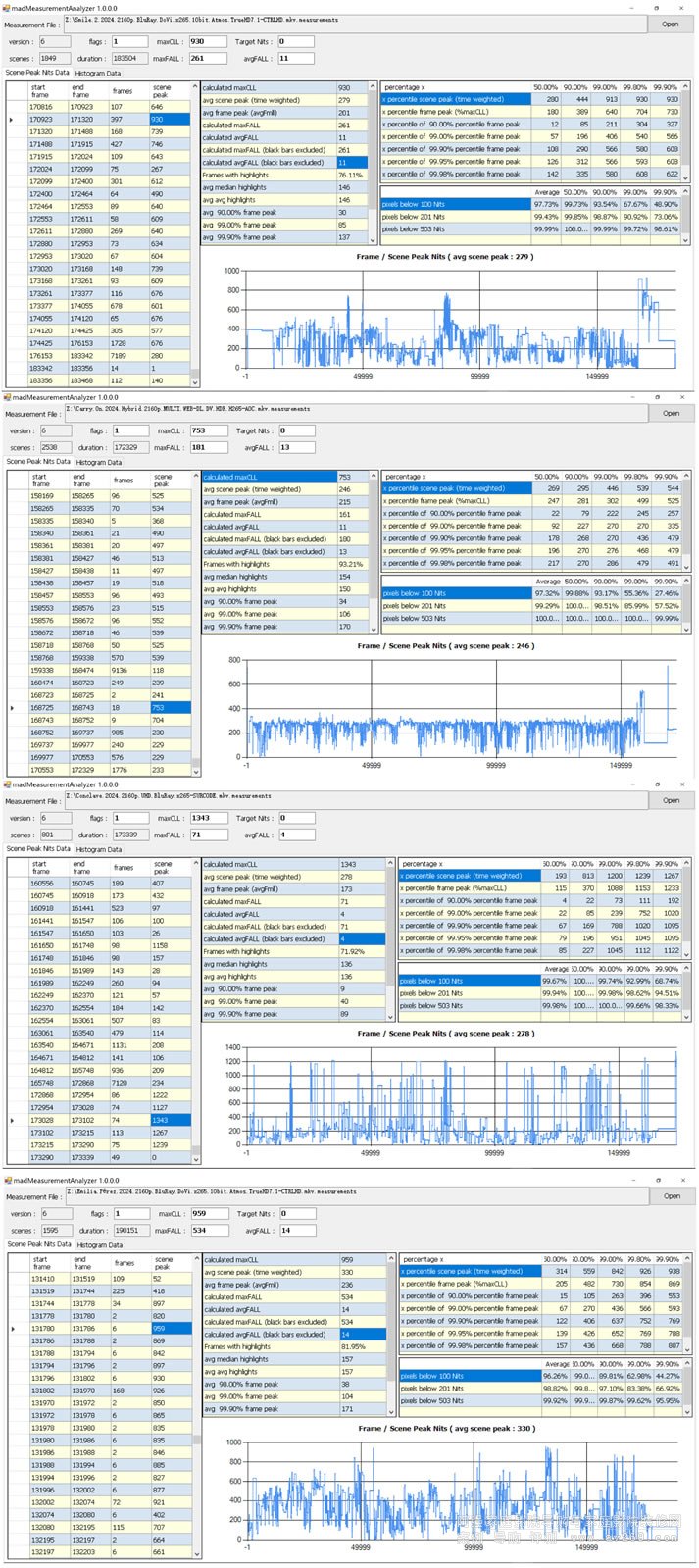 三、目前HDR影視的制作趨勢,我測量了最近下載的五部高流量的片子,大家看看其亮度圖: