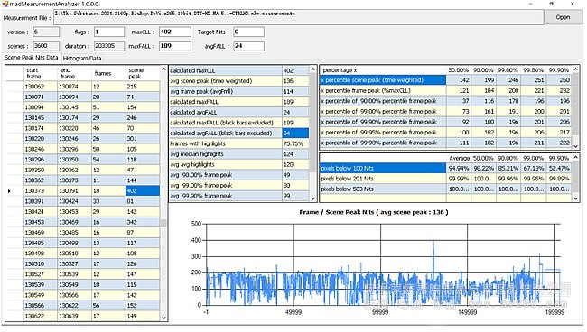 幀平均亮度幾乎都不超過20nit,甚至還有4nit的奇葩存在!所謂的峰值亮度幾乎都是出現在片頭或片尾的字幕或logo上!而實際畫面的加權平均峰值亮度也就是200-300nit!