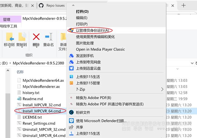 順便簡單說一下mpc渲染器,手工單獨安裝或更新時要注意:解壓縮文件到你的常用軟件安裝盤符后,要用管理員身份執行一下install,如下圖所示: