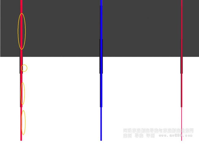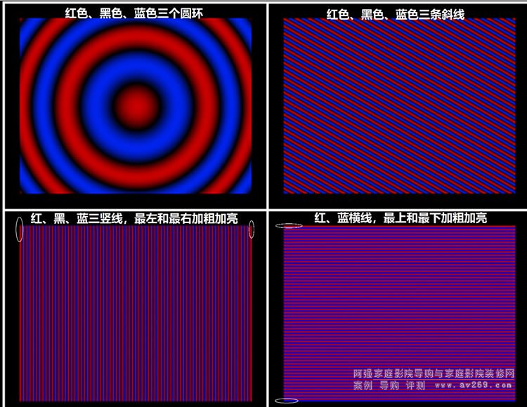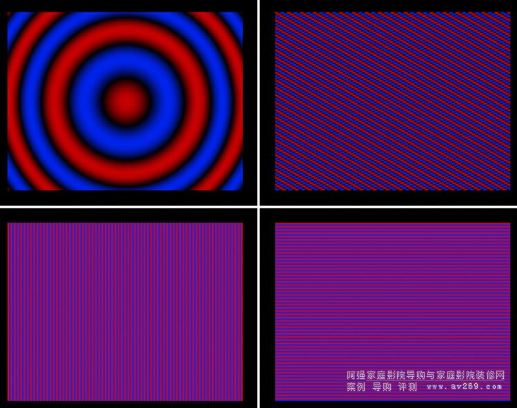 如果是大屏幕遠距離觀看但視力又不是5.0,建議要走到屏幕前進行鑒別:看紅黑藍三豎線或斜線是否有黑線的缺失,看最邊上的加粗加亮線是否變成全部都是如此了,分別看圓環(huán)和斜線的邊緣和紋理是否平滑無雜色!另外如果你用的算法或顯示設(shè)備的加銳過猛,那么你遠距離看:會看到非常明顯的震蕩現(xiàn)象!