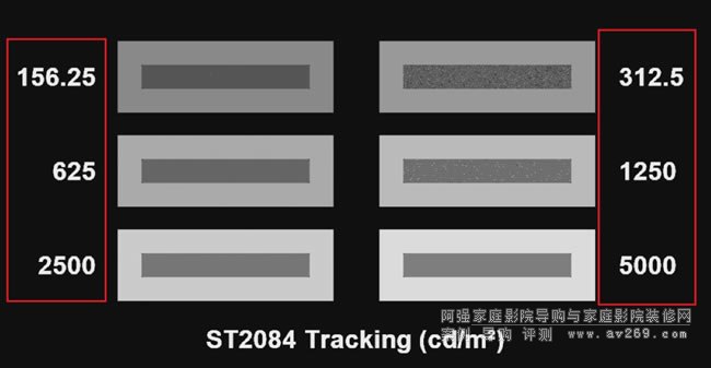 10000nit的EOTF追蹤圖分為了六個亮度追蹤框:156.25、312.5、625、1250、2500、5000,如果哪個框中看到有一個深色方塊在閃爍,說明你的顯示設(shè)備無法達到這個亮度或者是在用遠超此亮度的標(biāo)準(zhǔn)在顯示!所以這個測試項目完全可以被用來作為測試HDR顯示器的亮度和是否遵循ST2084 EOTF 曲線!不夠亮或是瞎亮都是不可取的!