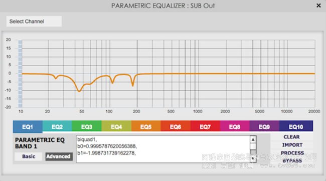 然后返回到miniDSP插件并打開您想要放置過濾器的PEQ塊。將其設置為“高級”模式,然后單擊“IMPORT REW FILE”(有時候它只是“IMPORT”,如下圖)。請注意,某些插件可能不支持REW正在使用的最大PEQ數量。查看插件的Data Sheet了解更多信息。選擇剛剛保存的文件,然后插件將顯示校正濾波器曲線。點擊“ PROCESS ”顯示您導入的biquad