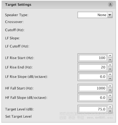在目標設置(Target Settings)中,將Speaker Type設置為“None”,將LF Rise Slope設置為0.0,將HF Fall Slope設置為0.0。(后面您可以嘗試不同的設置。)單擊“Set Target Level”設置目標級別。這只是初始值 - 在執行初始過濾器生成后,您需要在后面再手動調整它。
