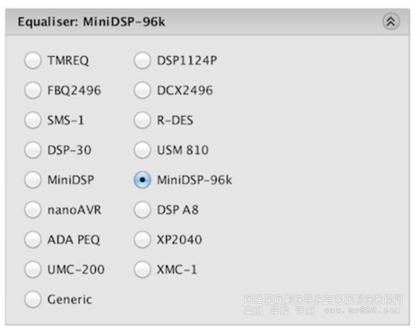 設置參數,如以下屏幕截圖所示。首先,將均衡器(Equaliser)設置為“MiniDSP”或者“MiniDSP-96k”,這取決于您的DSP是哪個型號或加載的哪個版本的插件。DSP的插件Datasheet里有說明插件是工作于48k還是96k。