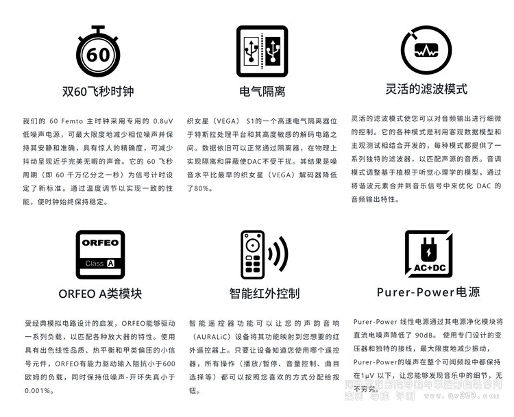為了追求卓越的動態范圍,揭示原始錄音中的微小細節,現代的Hi-End解碼器要求時鐘、電源和信號饋送都必須具有盡可能高的純凈度。織女星(VEGA) S1通過整合高速電氣隔離器來應對這一挑戰,隔離器被應用于特斯拉(Tesla)G3處理平臺與極為敏感的音頻電路之間的重要節點,保證了物理上的完全的隔離,屏蔽干擾,保護解碼器不受任何噪聲耦合的影響,同時還可以順暢傳輸數據。仰賴這些先進的功能,織女星(VEGA) S1有出眾的音頻清晰度和精確性,揭示音樂的本真。