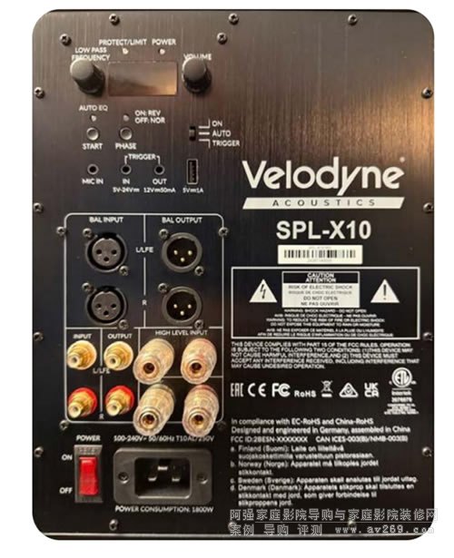 有源低音炮,254 毫米碳纖維音盆,可使用Velodyne Acoustics AutoEQ SUB 應用程序進行控制,自動房間校準,附帶帶支架的測量麥克風,封閉式外殼,線路輸入 RCA 立體聲/L FE,線路輸入 XL R 立體聲/LFE,揚聲器電平輸入,線路輸出 RCA 立體聲/LFE,線路輸出 XLR 立體聲/LFE,D 類 MOSFET 放大器,1. 200 瓦輸出功率、2,500 瓦脈沖功率、無級可變工作頻率、無級可變電平和相位、自動開關、后置顯示屏、觸發(fā)輸入/輸出