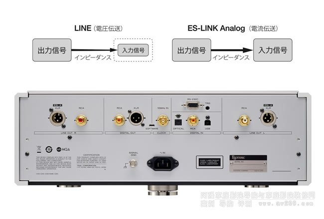 與擴大機接駁時,除了使用LINE連接(XLR、RCA)之外,還采用了ESOTERIC獨家的「ES-LINK Analog」傳輸方式,善用HCLD緩沖電路的強大電流供應能力,讓信號在傳輸路徑上不容易受到阻抗影響,而能將訊號強力傳送出去,將支持的器材潛力發揮到極致。