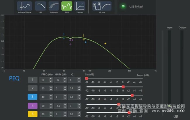 D類功放現(xiàn)在也是應(yīng)用得越來越廣泛,特別是歐盟那邊,倡導(dǎo)節(jié)能環(huán)保。Viator SUB12使用的也是新款D類放大器,能量轉(zhuǎn)換效率超過90%,待機(jī)功耗不到0.5W,大動態(tài)輸出功率可以達(dá)到950W,地動山搖無壓力。內(nèi)置DSP低管相當(dāng)強(qiáng)大,完全不輸專業(yè)低頻管理器,處理頻率范圍達(dá)到5~1KHz,自帶5組PEQ,高低切、限幅器一應(yīng)俱全,配合聲學(xué)分析儀用電腦軟件調(diào)音就非常順手,找好炮位測量后分分鐘拉出一條直線。
