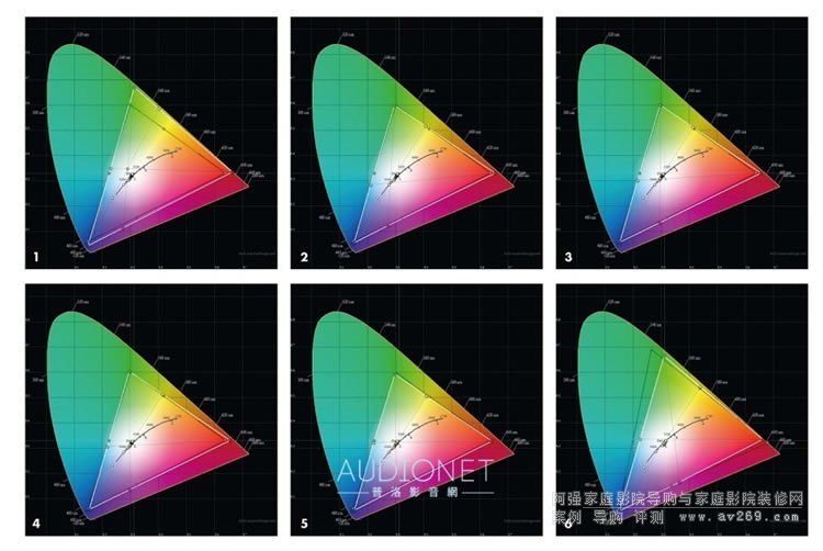 狀態下,它跟先前我測過的上位機種CH-LS12000B一樣,在五種模式中只有「動態」模式的實測色域超過HDTV標準ReC.709范圍(請見圖1);其他四種模式色域則與HDTV標準相近(圖2至圖5),由于CH-LS9000W播放一般影片與節目(SDR)沒有擴張色域,不會有過于濃艷丶顏色跑掉的問題,色彩的真實度蠻不錯。接著測本機在HDR視訊輸入狀態下的色域,測試結果5種模式的色域都一樣,請見圖6,我已經把黑色三角形換成DCI-P3,實測色域大約與SDR視訊輸入狀態下「動態」模式的色域相當,暖色系的廣色域性能優于冷色系。