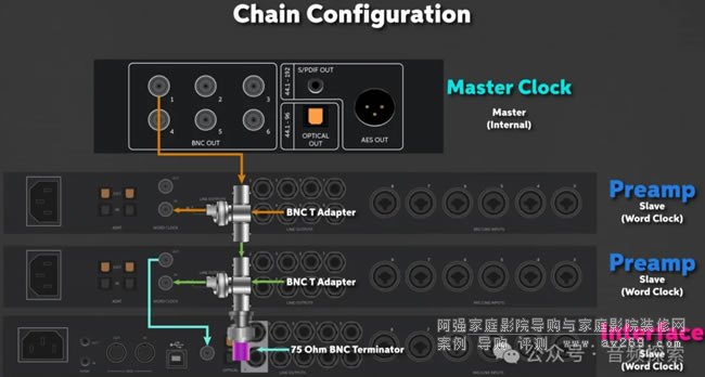 用一根BNC線纜,將外部主時(shí)鐘的OUTPUT接口連接到一個(gè)BNC T型轉(zhuǎn)接頭的一端。將這個(gè)T型轉(zhuǎn)接頭插入下一臺(tái)設(shè)備的Word Clock IN接口。再用一根BNC線纜,把該轉(zhuǎn)接頭的另一端與下一個(gè)設(shè)備上的T型轉(zhuǎn)接頭相連,依次將設(shè)備串聯(lián)起來(lái)。當(dāng)所有設(shè)備都連接完成后,在最后一個(gè)T型轉(zhuǎn)接頭上接上75Ω BNC終端電阻(Terminator),以保證信號(hào)穩(wěn)定。因?yàn)槿绻盘?hào)在末端沒(méi)有被吸收,則會(huì)發(fā)生反射,導(dǎo)致時(shí)鐘不穩(wěn)定。