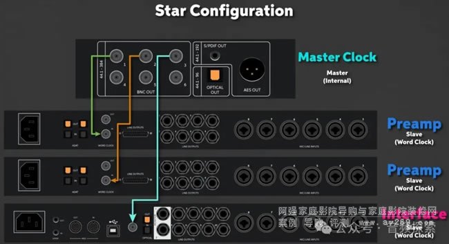 常見(jiàn)的做法是:主設(shè)備的時(shí)鐘輸出(例如Word Clock OUT、AES、ADAT等)連接到從設(shè)備的時(shí)鐘輸入,并在設(shè)置中將主設(shè)備設(shè)為“內(nèi)部(Internal)”,從設(shè)備設(shè)為“外部(External)”。這樣,所有設(shè)備就能按照同一基準(zhǔn)進(jìn)行采樣,避免因時(shí)序不一致而帶來(lái)的雜音或失真。