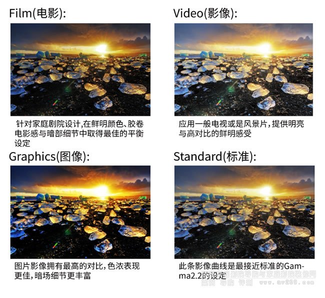 內(nèi)置多種Gamma調(diào)整方案(電影/影像/圖像/標(biāo)準(zhǔn)),不同使用環(huán)境只需要選擇不同的設(shè)定便,可輕松達(dá)到很好的顯示效果。