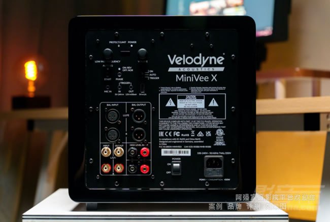 相比以前的MiniVee,MiniVee X在背部接口與操控設(shè)計(jì)上也進(jìn)行了全面升級(jí),更貼近現(xiàn)代家庭影院和Hi-Fi系統(tǒng)的使用需求。我們分成兩個(gè)部分介紹,上方區(qū)域主要是MiniVee X的操控調(diào)節(jié)區(qū)域,左邊的旋鈕是低通分頻器,主要控制低通濾波器的截止頻率,例如當(dāng)我們?cè)O(shè)置了一個(gè)頻率點(diǎn)80Hz,高于80Hz的低頻信號(hào)就會(huì)被衰減或者過濾點(diǎn),保證低頻信號(hào)不會(huì)跑到中高音單元,避免失真或者能量重疊;右邊的旋鈕就是常規(guī)的音量調(diào)節(jié),兩者之間的顯示屏用于顯示音量和分頻頻率。Trigger觸發(fā)輸出和輸出接口各一個(gè),支持外部設(shè)備聯(lián)動(dòng)開關(guān)機(jī),例如與AV功放或中控系統(tǒng)進(jìn)行同步控制。MIC IN 3.5mm麥克風(fēng)插孔,配合附帶的測試麥克風(fēng)一起使用,用于空間自動(dòng)修正。