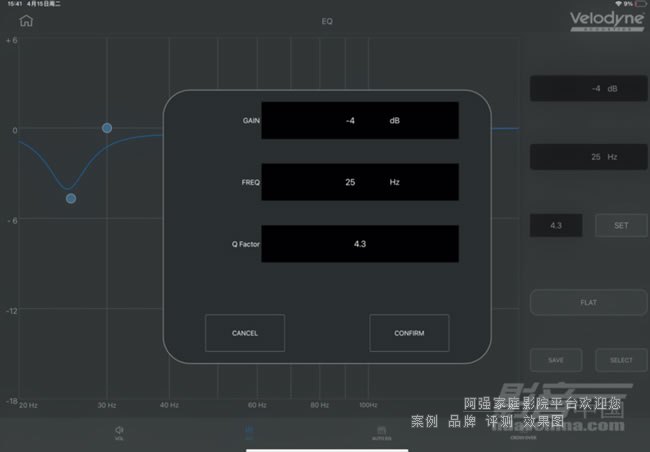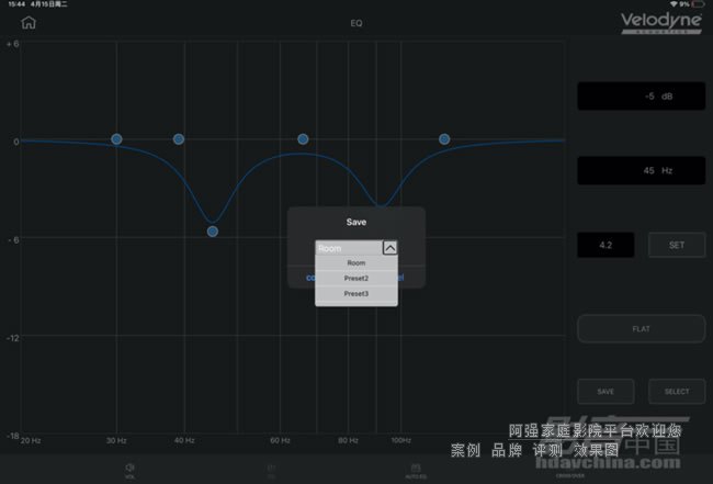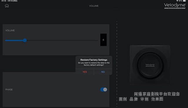 我先后用過Velodyne幾款調(diào)試軟件,這次使用到的Velodyne Acoustics AutoEQ SUB App是體驗(yàn)感最好的,而且比大多數(shù)品牌的App操作更便捷。App通過藍(lán)牙與MiniVee X連接,配對(duì)過程迅速,無需繁瑣設(shè)定即可進(jìn)入主界面。整體功能布局清晰,主要分為四大操作區(qū)域。第一區(qū)是基礎(chǔ)的音量調(diào)節(jié)和相位開關(guān),App顯示內(nèi)容與機(jī)身顯示屏是鏡像同步的,無論是通過App調(diào)節(jié)還是旋鈕手動(dòng)調(diào)節(jié),都能即時(shí)反映。長按右上角的“Velodyne Acoustics” Logo則能選擇是否進(jìn)行出廠化設(shè)計(jì)。