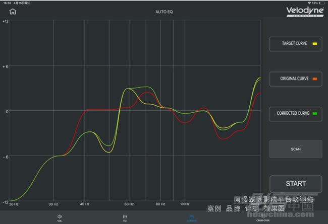 第三區(qū)域是整個(gè)App的核心功能——空間自動(dòng)修正系統(tǒng)。在我使用過的幾種空間修正技術(shù)中,Velodyne Auto EQ可能是最省心的。實(shí)際操作也非常簡單,將測試麥克風(fēng)插入MiniVee X背面的MIC IN插孔,將麥克風(fēng)放置在朝向低音炮50cm左右的位置,點(diǎn)擊App上的Scan鍵,這時(shí)候低音炮會(huì)發(fā)出測試音,收集近場原始頻響數(shù)據(jù),并在App上生成原始曲線;隨后再將麥克風(fēng)放到聆聽位,點(diǎn)擊START鍵,低音炮會(huì)發(fā)出幾次測試音,并且啟用內(nèi)部DSP進(jìn)行自動(dòng)修正。