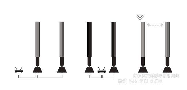 如果您想將兩個揚聲器連接到 Soundcenter 或電視機上的一個 PL 插孔,并且無法在揚聲器之間布線,則需要額外的 Power Link 分離器,請聯系 Bang & Olufsen 零售商以獲取更多信息。
