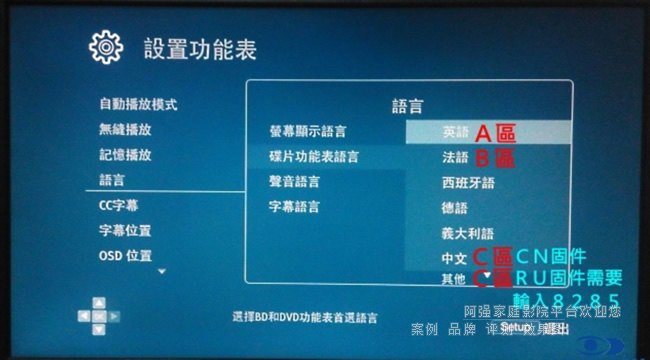 在播放設置->語言->碟片功能表語言,英語=A區,法語=B區, 在CN固件選中文是C區, 但在RU固件需要選其他中輸入8285成為俄語才是C區