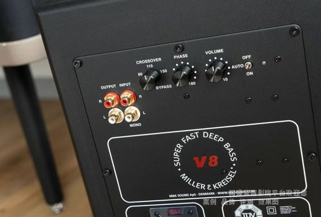 V8 低音炮的背部空間設計豐富:配備 2 組 RCA 接口(1 組輸入,可兼容單聲道線纜;1 組輸出),以及 3 個調節旋鈕,分別用于微調截止頻率(分頻點)、相位和音量。作為有源低音炮,它還設有電源接口,并支持信號感應自動開機功能 —— 一旦接收到信號便自動啟動;反之,無信號輸入時,經過短暫等待后會自動進入待機模式,讓正面的 8 英寸低音單元得到休息。
