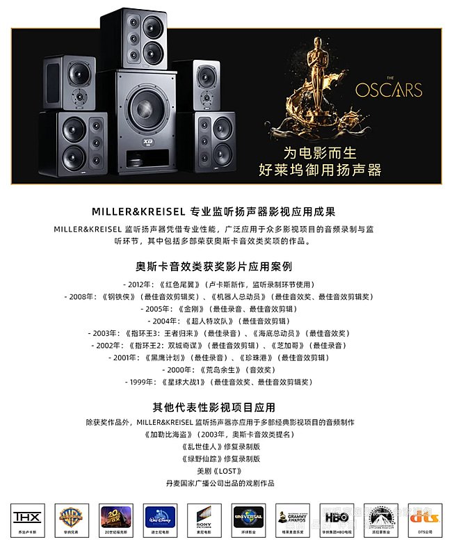 Miller & Kreisel 于 1974 年在美國(guó)比佛利山誕生,創(chuàng)始團(tuán)隊(duì)匯聚了 Jonas Miller 先生、Ken Kreisel 先生、Lester M. Field 博士及 Chuck Back 先生四位核心力量。憑借多項(xiàng)行業(yè)開創(chuàng)性技術(shù),品牌成功奠定行業(yè)領(lǐng)先地位 —— 不僅發(fā)明了世界首款有源主動(dòng)式分頻超低音炮,打造出全球第一套衛(wèi)星喇叭 + 超低音系統(tǒng),更成為首家通過 THX 認(rèn)證的音箱制造商。其核心技術(shù)被杜比、THX 廣泛應(yīng)用于多聲道音效格式研發(fā),成為行業(yè)技術(shù)標(biāo)桿。五十余年來,Miller & Kreisel 音箱憑借低失真、高解析力的核心優(yōu)勢(shì),還原極致真實(shí)的音質(zhì),不僅成為迪士尼、華納、盧卡斯影業(yè)等頂級(jí)影視公司的指定監(jiān)聽設(shè)備,更深度覆蓋專業(yè)音樂錄音與高端家庭影院領(lǐng)域,在專業(yè)音頻與消費(fèi)級(jí)音頻市場(chǎng)始終保持領(lǐng)導(dǎo)地位。